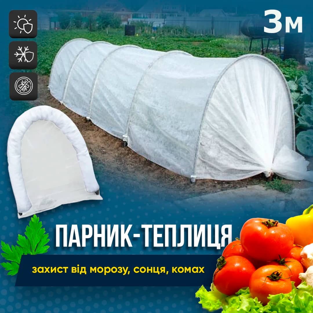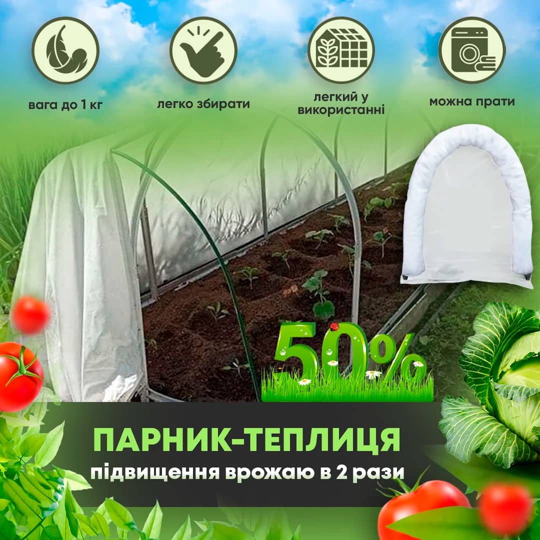 Конструкція парника витримує пориви вітру 15м/с. Щільний каркас і полотно зберігає рослини при температурі нижче -7°С та спеці понад +40°С. Термін служби парника становить понад 5 років.